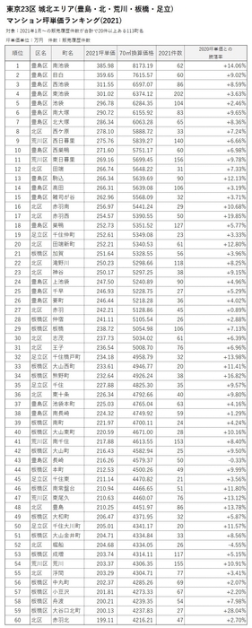 「マンションレビュー」のデータで見る「東京23区のマンション相場変遷10年」 城北エリアでの町名ランキングを発表!
