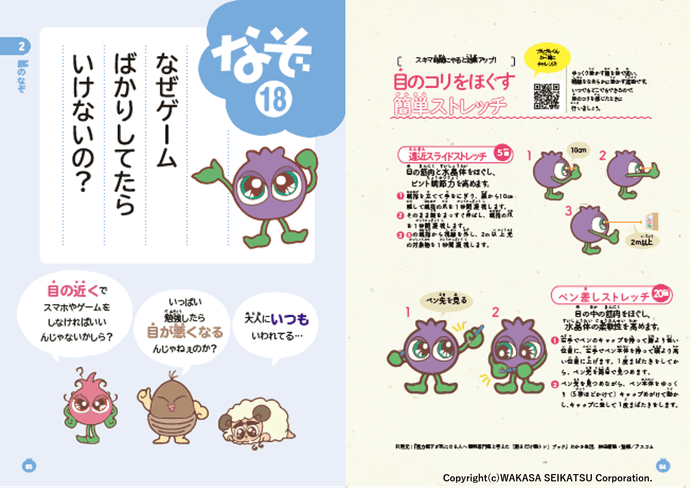 『ブルブルくんのからだ大百科』では、そんな子どもたちの疑問に答えるべく、わかさ生活のキャラクターブルブルくんが仲間たちとともに、身体や心に関する健康の「なぞ」を30個を授業方式で解決していく内容となっており、小さなお子様にも楽しんでいただける1冊となっています。