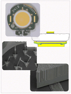 Tri-LEDコンポーネントは、GaN-on-GaNLEDで、LightchipはシリコンベースのWLPが採用されていますが、SORAA社は、これらLEDのユニークな縦型構造を作成するため、光透過性、および高い電気・熱伝導性のようなGaNの特性を上手に使用しています。