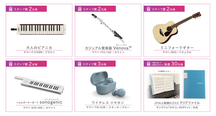コンテストは、演奏を楽しんでいるか、動画に創意工夫があるか等をポイントに審査を行い、入賞者には「大人のピアニカ」や「カジュアル管楽器 Venova™(ヴェノーヴァ)」、「ショルダーキーボードsonogenic (ソノジェニック)」、「ミニフォークギター」といった、はじめてでも気軽に演奏を楽しめるヤマハ楽器等の豪華プレゼントを用意しています。