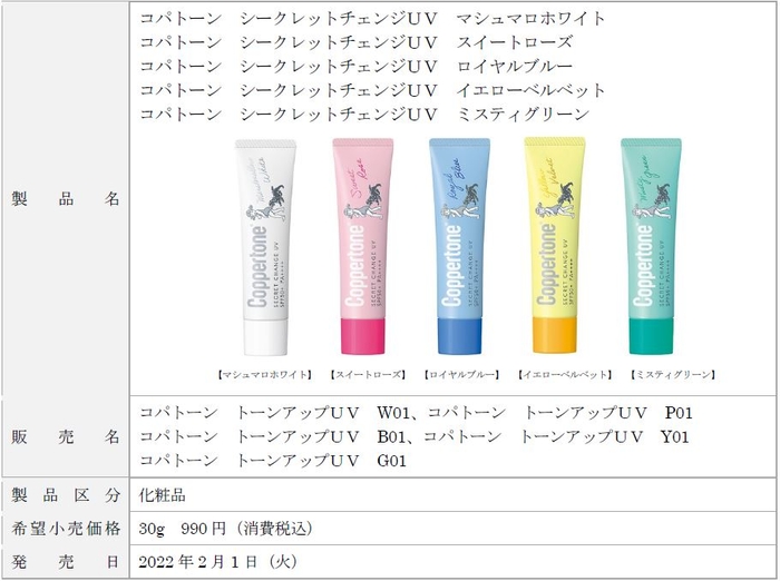 「コパトーン シークレットチェンジUV」シリーズは、SPF50+、PA++++のUVカット機能に加え、お肌の色味を明るくするトーンアップ※1が叶う日焼け止めです。なりたい肌の印象やその日の気分によって選べる、計5色のカラーバリエーションをご用意しました。