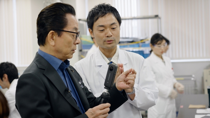 新商品「リアップX5チャージ」の開発チームと、その製造現場を訪ねた水谷さん。自ら360度カメラやマイクを持ち、レポーターのようにふるまって撮影に参加します。