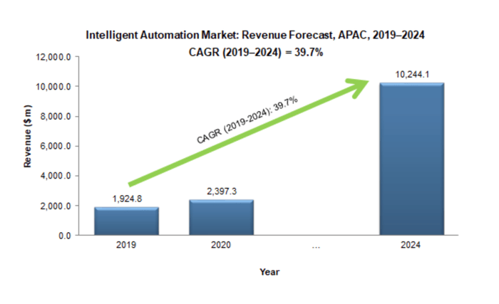 新型コロナが世界中の多くのセクターに影響を与えるなか、IAソリューションの導入は今後2~3年に増加すると予測され、BFSI(銀行・金融サービス・保険)、製造業、ヘルスケアなどの分野の企業からの需要増加が見込まれます。フロスト・アンド・サリバンは、インテリジェントオートメーション市場は、2019年の19億ドルから2024年には102億ドルへ増加し、その年平均成長率は39.7%と予測しています。