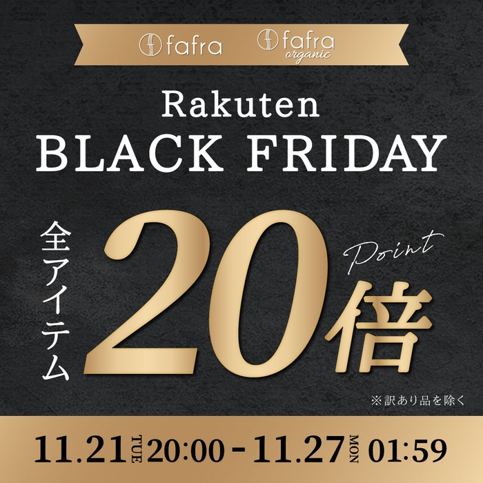 オーガニックライフスタイルブランド「fafra(ファフラ)」「fafra organic(ファフラオーガニック)」(株式会社G.Oホールディングス:大阪府大阪市)は、11月21日〜11月27日の期間中【楽天ブラックフライデー】にて全アイテム《ポイント20倍》を実施いたします。