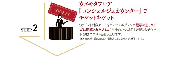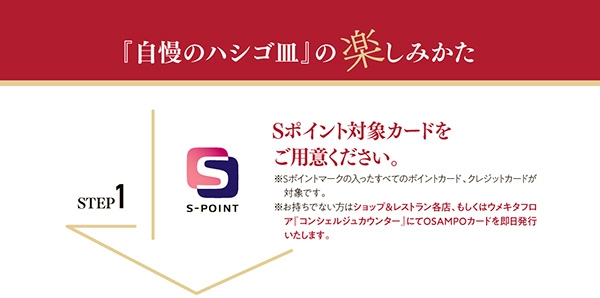 Sポイント対象カードをご提示&クイズに正解で、ウメキタフロア15店舗の自慢のメニューから、3皿分を自由に選べるスペシャルチケットをプレゼントします。