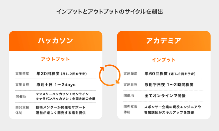 学年不問のエンジニア学生のキャリア支援プログラム『技育プロジェクト』の一環として、ハッカソンとアカデミア(技術勉強会)を通して継続的なインプットとアウトプットの場を提供するスキルアップ支援プラットフォーム「技育CAMP」内で本年より実施する新企画です。
