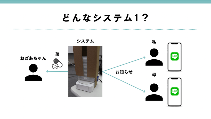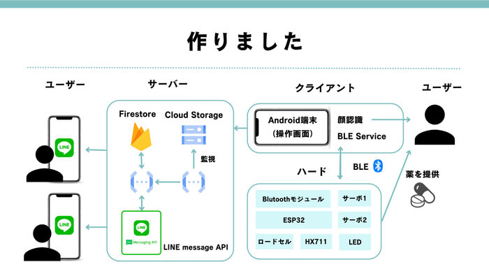 祖母が薬を飲み忘れてしまうという問題を解決すべく、自動で服用記録を取り、家族と共有できるお薬手帳アプリを実装。サーバー、クライアント、ハードの実装を全て一人で手がけた。アプリ使用中に画面を遮らないためにバックグラウンドで写真撮影ができるようにしたり、画像処理の負担を少なくする等の工夫を凝らした。