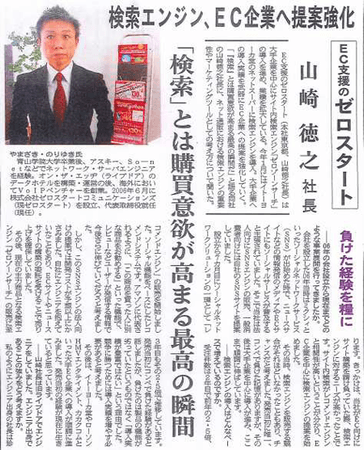EC検索ソリューションのゼロスタートは、日本流通産業新聞社が発行する「日本ネット経済新聞」にて導入推進に関する取材を受け、記事紹介されましたことをお知らせ致します。