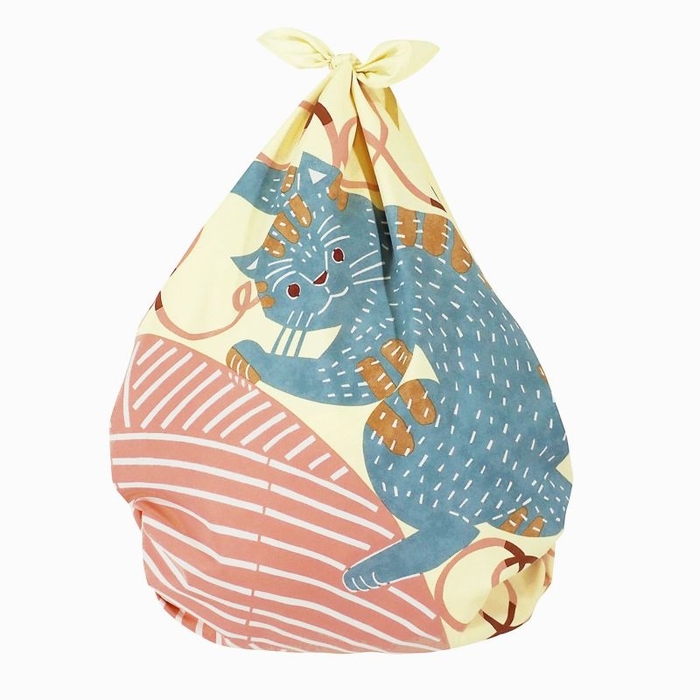 クリームイエローの地。やわらかいピンク、茶色の毛糸。黄茶色に茶色のブチ猫と、スモークブルーに白茶のブチ猫。猫と同色の蝶。毛糸玉にじゃれる猫の表情がかわいらしい風呂敷。