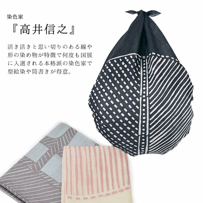染色作家 高井信行が設立した「染色工房たかい」にある型紙から文様を選定し、デザインされた風呂敷。エコバッグとしての利用はもちろん、大判なのでストールとして身に着けてもお洒落。自分用にも、ちょっとした贈り物にもオススメ。