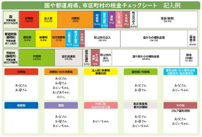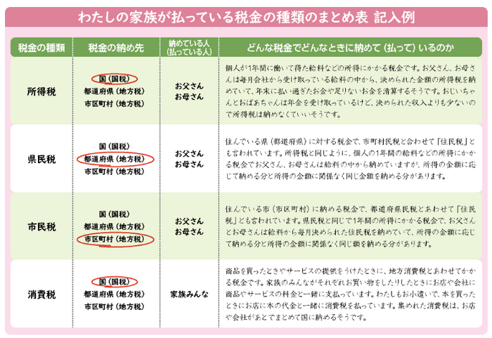 「子どもたちにとっても身近」とは言っても、種類がいろいろあるのが税金です。まずはレシートをチェックしたり、家族にインタビューしたりして身近な税金の種類を知ることからはじめ、自分や家族がどんな税金を払っているのか、国や都道府県・市区町村にはどんな税金が集められているのかなどを調べていく自由研究です。税金との関わりについて学ぶことができ、「調査シート」「税金の種類まとめ表」「国や都道府県、市区町村の税金チェックシート」「まとめ用シート」など自由にダウンロードできるワークシートも用意。こちらは学校における租税教育教材としても活用でき、授業の中で調べたりまとめたりするのにも役立ちます。
