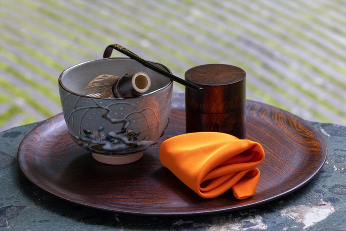 本茶会では、星のや京都のスタッフが抹茶を一服ずつ丁寧に点ててもてなします。茶席では、武者小路千家(むしゃのこうじせんけ)の家元教授*2が見立てた茶道具を使います。武者小路千家は、表千家・裏千家とともに茶の開祖・千利休(せんのりきゅう)の侘(わ)び茶を継承する三千家の一つです。特に抹茶椀は、清水焼・利昇窯(りしょうがま)三代目の加藤利昇が手掛けた星のや京都オリジナルです。本茶会のためのこだわりの茶道具がお客様をもてなします。