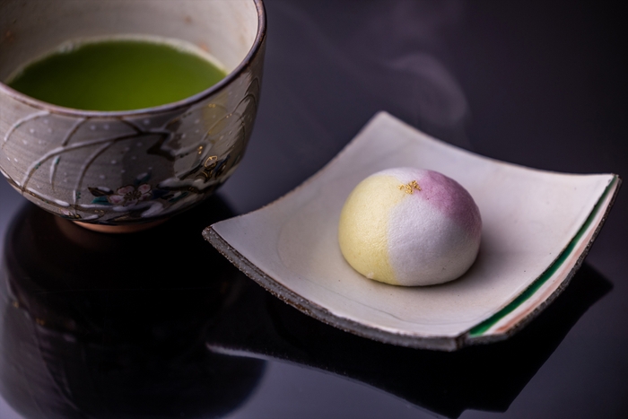 本茶会では、あたたかな和菓子と抹茶を提供します。和菓子は、1803年創業の京菓子司(きょうがしつかさ)「亀屋良長(かめやよしなが)」が本茶会に参加するお客様のために作った上用饅頭(じょうようまんじゅう)で、手まりがモチーフです。せいろで蒸したあたたかな状態で提供するので、ほのかにたつ和菓子の甘い香りとやわらかな口あたりを楽しめます。抹茶は、京都・宇治の「利招園茶舗(りしょうえんちゃほ)」が星のや京都のために茶葉を厳選し、挽いたものです。茶の一服が旅の「記録」になるように、また星のや京都の目の前を流れる大堰川(おおいがわ)の澄んだ翡翠(ひすい)色にちなんで「録碧(ろくへき)」と名づけられました。