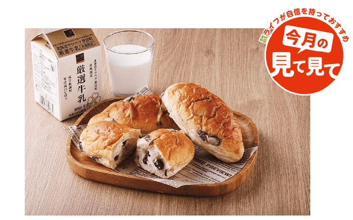 ライフが自信を持っておすすめする「今月の見て見て」の近畿圏10月商品に選ばれた「厳選牛乳を使ったレーズンロール」は、フルーティなレーズンとミルクの風味を感じるレーズンロールです。素材・製法にこだわりおいしさを追求したプライベートブランド“ライフプレミアム”の「北海道サロベツ豊富町 厳選牛乳」を使用したしっとり生地に、オレンジリキュールを配合して漬け込んだライフオリジナルレーズンを練り込みました。