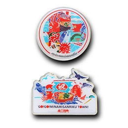全国各地に「ご当地グルメ」はいろいろありますが、宮城県本吉郡の南三陸町の「南三陸キラキラ丼」は、四季を通して最高の品質と新鮮な南三陸の幸が味わえ、目でも舌でも楽しめると大人気のオリジナルメニューです。とかく食べ物に目が行ってしまいがちですが、南三陸の魅力はそれだけではありません。もっと多くの人に南三陸の魅力を知ってもらいたいと、一般社団法人 南三陸町観光協会様がオーダーメイドされたのが、「大漁旗ロゴピンバッジ」です。南三陸町のPRとノベルティを兼ねて製作されました。