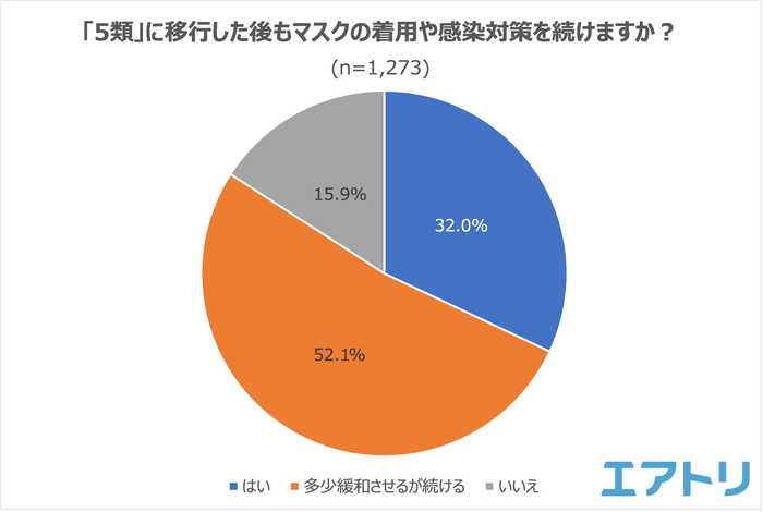 「5類」に移行した後もマスクの着用や感染対策を続けるか聞いたところ、「はい(続ける)」と回答した人が32.0%、「多少緩和させるが続ける」が52.1%となり、8割以上となる計84.1%の人が対策を続けることがわかりました。