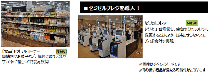 商品ケースを変更し品ぞろえを拡充することにより、高まる内食・中食ニーズに対応いたします。また、スムーズなお会計を実現するため、セミセルフレジを導入いたします。
