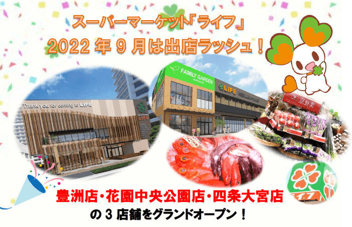 “おいしい” “ワクワク” “ハッピー” をお届けするライフコーポレーションは、2022年9月に首都圏で「豊洲店」、近畿圏で「花園中央公園店」「四条大宮店」の計3店舗をオープンいたします。