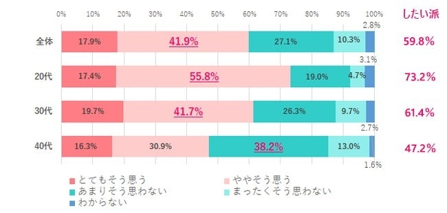 フォローが手厚くなくてもリモートワークがしたいかを聞くと、20代・30代はそれぞれ「したい派」が73.2%、61.4%と多数派でした。一方で40代は「したい派」が47.2%と過半数を割り、「あまりそう思わない」38.2%が最も多い結果となりました。