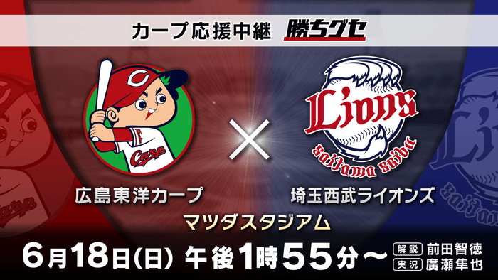 広島ホームテレビ(HOME:本社・広島市中区)は、6月18日の午後1時55分から、カープ応援中継「勝ちグセ」を生放送します。