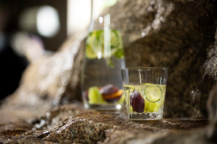 また、大量の汗をかいた体は、塩分と糖分を含んだ水分を補給する必要があります(*4)。そこで、それらを含んだオリジナルウォーターを用意しました。シャインマスカットやプルーンなどの果物の甘みを加え、清涼感のあるミントで香りづけをしています。効率的に水分補給ができるだけでなく、果物の甘みと爽やかな香りで気分をリフレッシュできます。