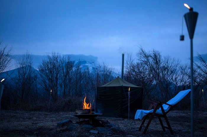 正面に浅間山を望む高台を貸し切りにして、サウナ室と外気浴を行う席を用意します。サウナ室は、薪ストーブの上に石を敷き詰めて高温にし、それらに水をかけることで高温の水蒸気を発生させ、約70度にまで上昇させます。高温のサウナ室で大量の汗をかき体内の熱を放出することで、脳の思考は限定的になり、余計なことを考えにくくなります。また、薪の燃える音を聞き、火の揺らめきを見ることで心が落ち着き、外気浴でのリフレッシュに繋がります。なお、スタッフも同行して室内の温度管理を行うため、サウナ初心者の方でも安心して参加できる体験です。