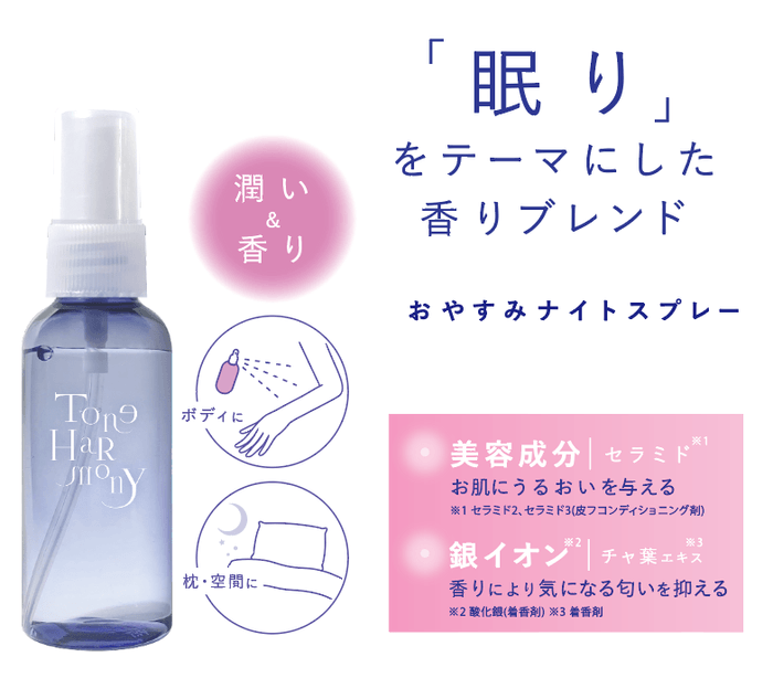 トーンハーモニーは、ピローアロマである「STトーンハーモニー おやすみナイトスプレー」や、睡眠前のリラックスやストレッチに使える「STトーンハーモニー おやすみナイトツボテープ」という快適な就寝環境をサポートするグッズを販売いたします。優しい香りに癒やされたり、軽く体を動かすことで穏やかな入眠をサポートします。