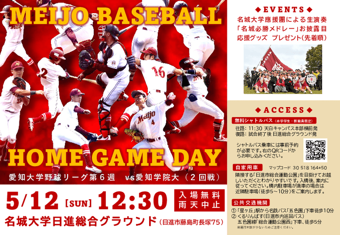 名城大学硬式野球部は、5月12日(日)名城大学日進総合グラウンドにおいて愛知大学野球リーグ第6週(VS愛知学院大)を開催いたします。