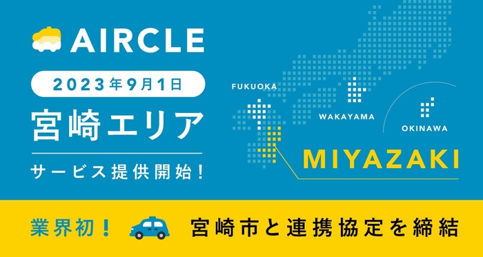 運転代行配車プラットフォーム「AIRCLE(エアクル)」は、利用者と運転代行業者を繋ぐ配車プラットフォームサービスです。現在は沖縄県、福岡県、和歌山県の3県に展開し、国内最大級の運転代行配車サービスとしてシェアを広げています。今回4つ目のエリアとして宮崎県での展開を開始いたします。対応エリアは宮崎市内より順次拡大予定です。