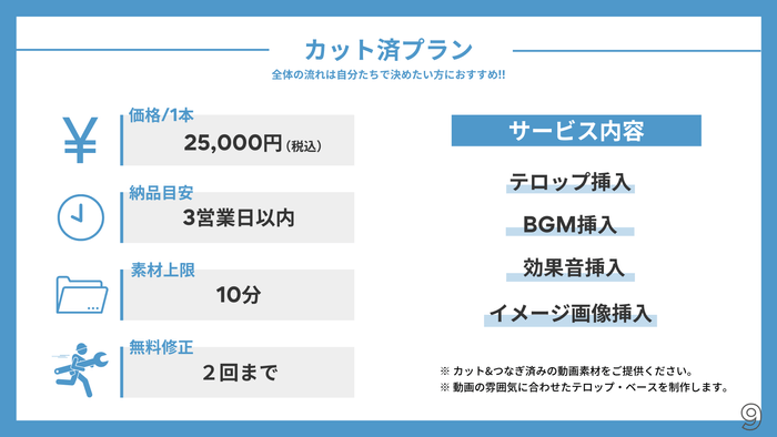 この他にも、企画立案・撮影・編集までを一貫して行うプランや、Short動画編集、サムネイル作成なども対応しております。