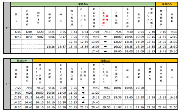 また、この増便とあわせてダイヤ改正を実施し、朝の京都発の初発便の時間を大幅に早め、天橋立や丹後方面への観光が便利になるとともに、京都発の最終便を繰り下げることにより、丹後地域の皆様が京都市内でのビジネスや観光に大変ご利用しやすくなります。