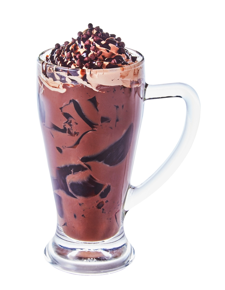 自家製コーヒージェリーにチョコレートドリンクを加えて、ベルギー産のチョコレートホイップクリームをのせました。上からチョコレートソース、仕上げにはチップチョコをトッピング。チョコレートの濃厚な甘さとほろ苦いコーヒージェリーが絶妙なバランスです。太めのストローでよく混ぜてお召し上がりください。