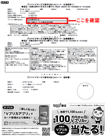 Vプリカ購入後、レジで受け取るプリペイドサービスお知らせシートに「当たり発行コード」の記載があれば当たりです。