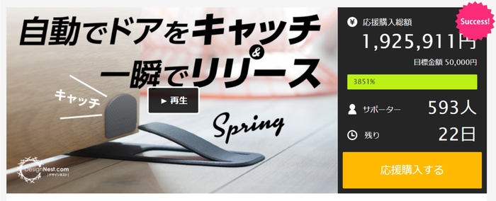 株式会社ウィズキュリオス(本社:福岡県福岡市/代表取締役:上崎 圭哲)は、しゃがまずに自動でドアをキャッチして、リリースも一瞬で済むドアストッパー【Spring/スプリング】をクラウドファンディングサービス「Makuake」にて、先行予約販売を開始してプロジェクトの支援者が590人超えを達成しました。