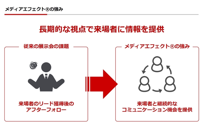 これまでのリアルイベントやオンライン展示会とは異なり、オンラインの強みを活かした長期的な視点で出展社と来場者の関係構築を強化するメディア一体型のオンライン展示会プラットフォーム。