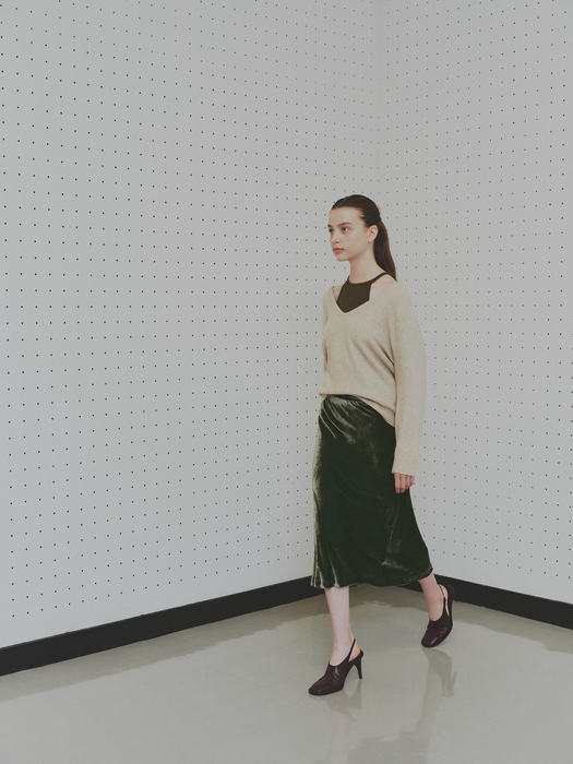 調節可能な肩紐は微配色の細ベルベットで華奢に仕上げ、ドレッシーに楽しめる一方、シアーニットをIN した着こなしで気負わず日常にも楽しめます。