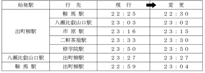 今回の変更は、同日に実施される京阪電車のダイヤ変更に合わせて実施するもので、主に「平日ダイヤ」における朝ラッシュ時間帯及び「平日ダイヤ」「土曜・休日ダイヤ」における夜時間帯の出町柳駅での接続を調整した内容としています。