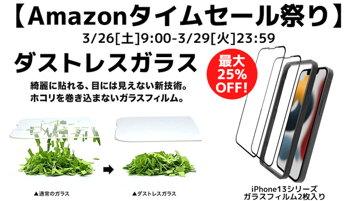 【Amazon限定ブランド】「Toride(トリデ)」は、ネット通販サイト「Amazon.co.jp」にて、明日3月26日(土)から3月29日(火)まで開催される「Amazonタイムセール祭り」にてiPhone13 / 13 Pro / 13 mini / 13 Pro Maxでご利用いただけるガラスフィルム2枚組を最大25%OFFで販売します。