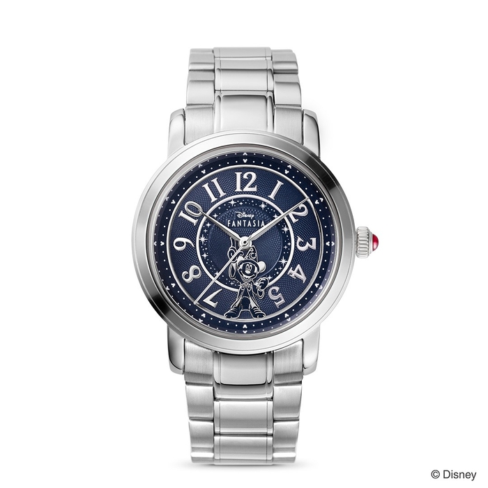 「ミッキーマウス」が魔法使いの弟子として登場したディズニー映画『ファンタジア』の世界観を、機械式腕時計で表現しました。メタリックな銀色のステンレスのベルトとケースに、深いネイビーの文字盤がシックでクールな印象。6時の位置には、作品を代表する象徴的なポーズの「ミッキーマウス」が。さらに、インデックスの書体や、メモリの小さな「ミッキーマウス」のアイコンに至るまで、細部にこだわり作品の世界観を表現しています。