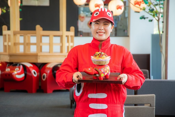 車内では、当ホテルが開発したオリジナルのスイーツセットを楽しめます。スイーツが盛られる器は、地域の縁起物をモチーフにしており、福島の美味しいものを食べて幸せになってほしいという想いが込められています。