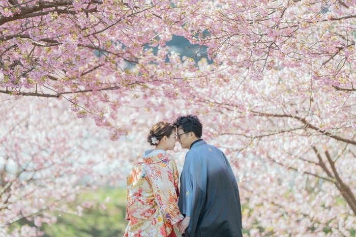 毎年大人気の桜ロケーションプラン。淡いピンク色の花が視界いっぱいに咲き誇る景色とともに、春らしいウェディングフォト撮影ができます。ドレスにも着物にも合うので、和洋両方の衣装での撮影もおすすめです。