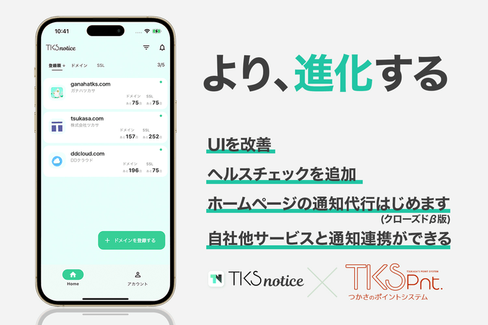 国内初のドメイン・SSL有効期限通知アプリ【TKS notice】のアップデートで、ヘルスチェック/ホームページ通知代行クローズドβ版の追加、UIの変更を行いました。