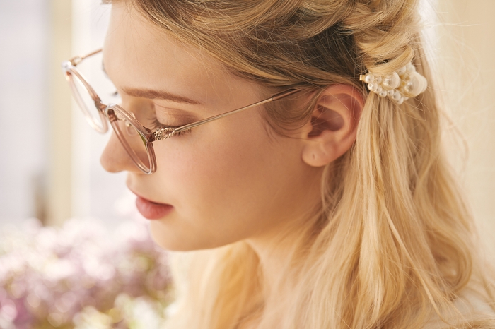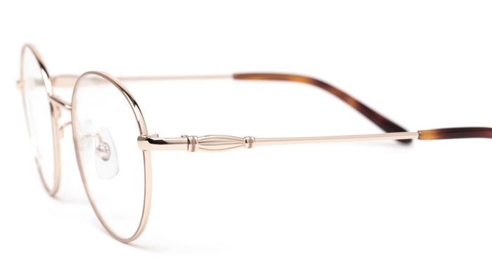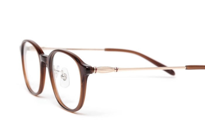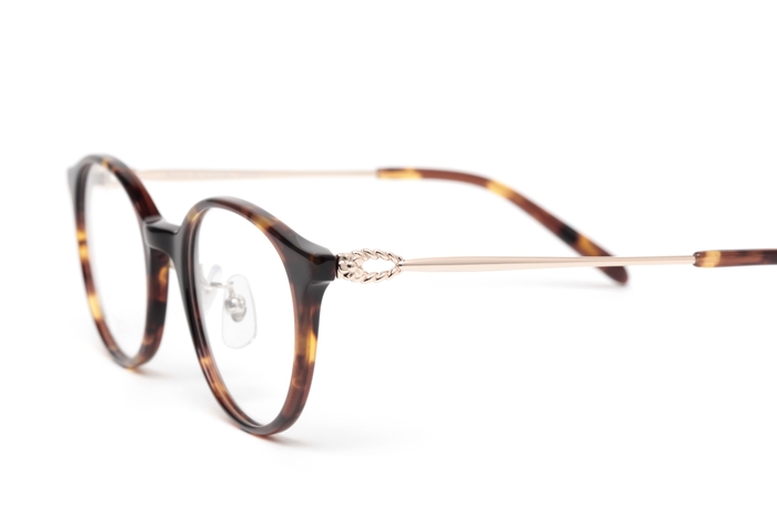 レンズ枠がプラスチック、テンプルがメタルのコンビネーションフレーム。ボストン型のレンズシェイプで、テンプルの丁番部分には花かんむりをイメージした飾りを施しました。