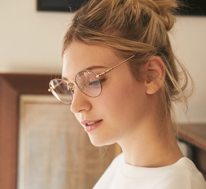 レンズの上下幅が浅めのベーシックなデザイン。プラスチックのテンプル仕様で、丁番部分にはスズランのモチーフを丸いメタル飾りに施しました。