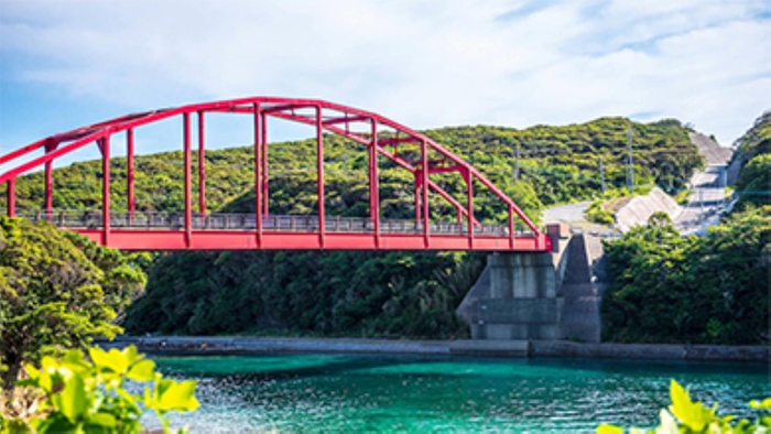 対馬中部の東側に位置する沖ノ島と赤島の海峡に架かる赤い橋が目を引きます。橋の下に広がるのは、全国屈指の美しいエメラルドグリーンの海、そして、複雑なリアス式海岸が織りなす緑の島なみからなる、対馬らしい絶景をお楽しみください。