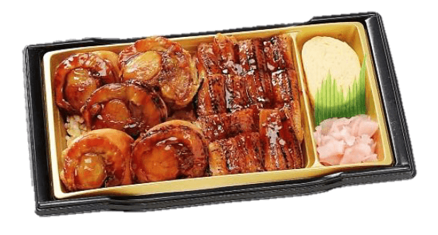 北海道産ほたての照り焼きに、焼き穴子が入った魚介たっぷりの重物。