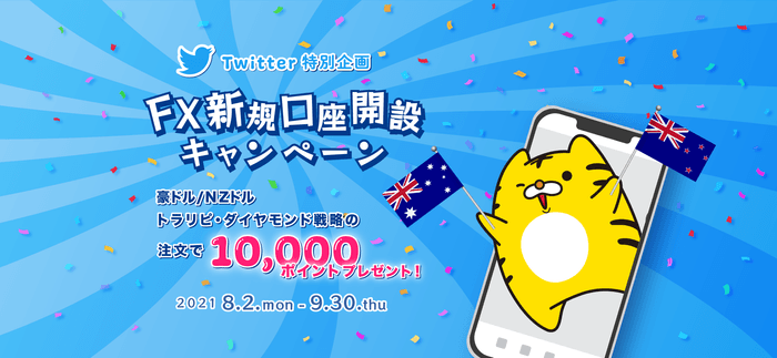 FXの新規口座開設時に当社公式Twitterアカウントで公開中のキーワードを入力いただき、口座開設後に100万円以上の入金&対象のトラリピ戦略をご注文いただくと、もれなく10,000マネースクエア ポイント※をプレゼントいたします。