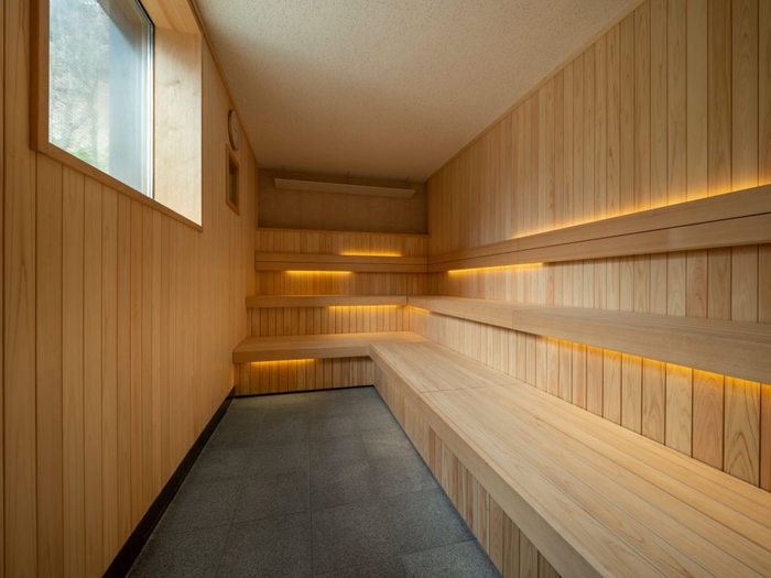 トンボの湯のサウナは、小窓からのぞく四季の景色が特徴のひとつですが、サウナ体験がより良いものになるよう照明を変更しました。空間に合わせてバランスよく配置した間接照明がやわらかな光でリラックス感を生むと同時に、モダンな雰囲気を作り出しています。
