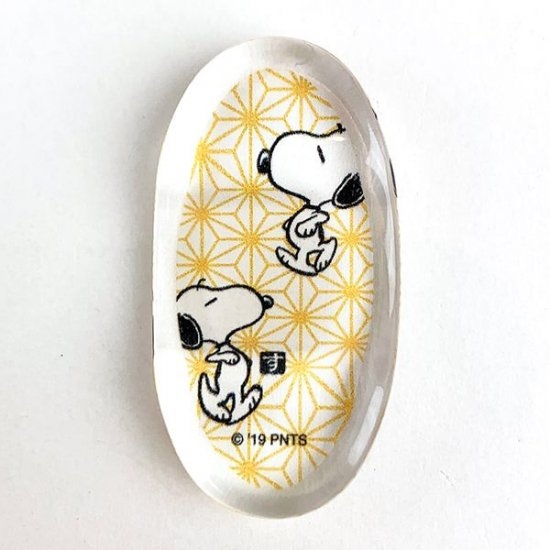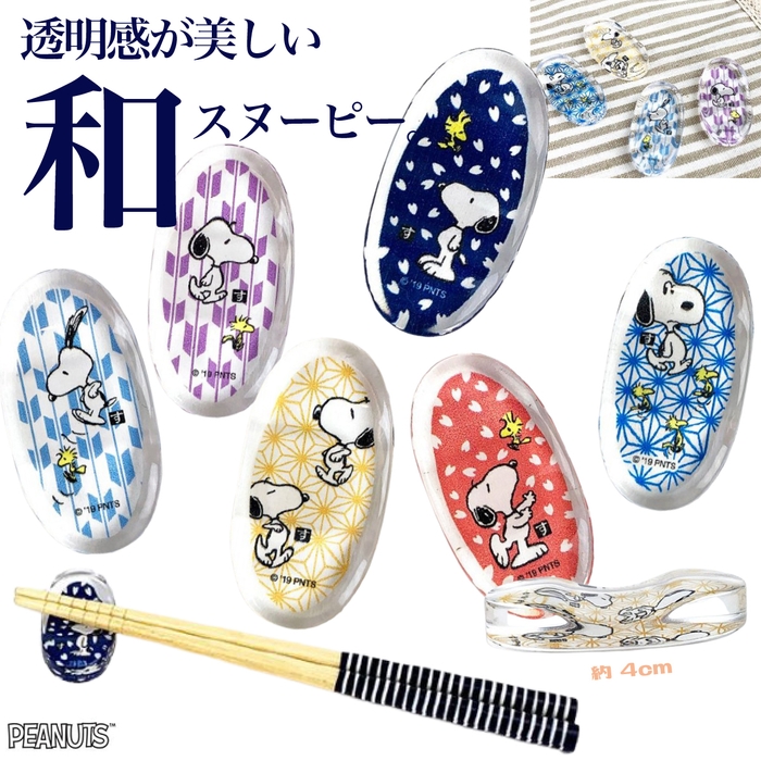 オーバルフォルムのアクリル樹脂製の箸置き。ガラス風の透明感が高くて、アクリルなので割れづらいといういいとこ取り。スヌーピーのデザインが描かれています。麻の花が背景にデザインされていて、和テイストな仕上がり♪