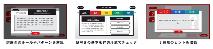 まずは謎解きのルールやパターンについて学ぶことができる機能です。謎解き後に解説を読むことができる「謎解き解説」と、辞典形式で好きなときにチェックすることができる「ポケット謎辞典」。いずれもSCRAP出版より販売中の『SCRAP presents 謎図鑑』の内容を一部抜粋し収録しています。「たぬき問題」「クロスワード」など馴染みのあるものから、謎解きの考え方のコツまで幅広くカバーしており、初心者の方が基礎を学ぶ際にも、知識を蓄えて成績アップを狙う際にも役立ちます。